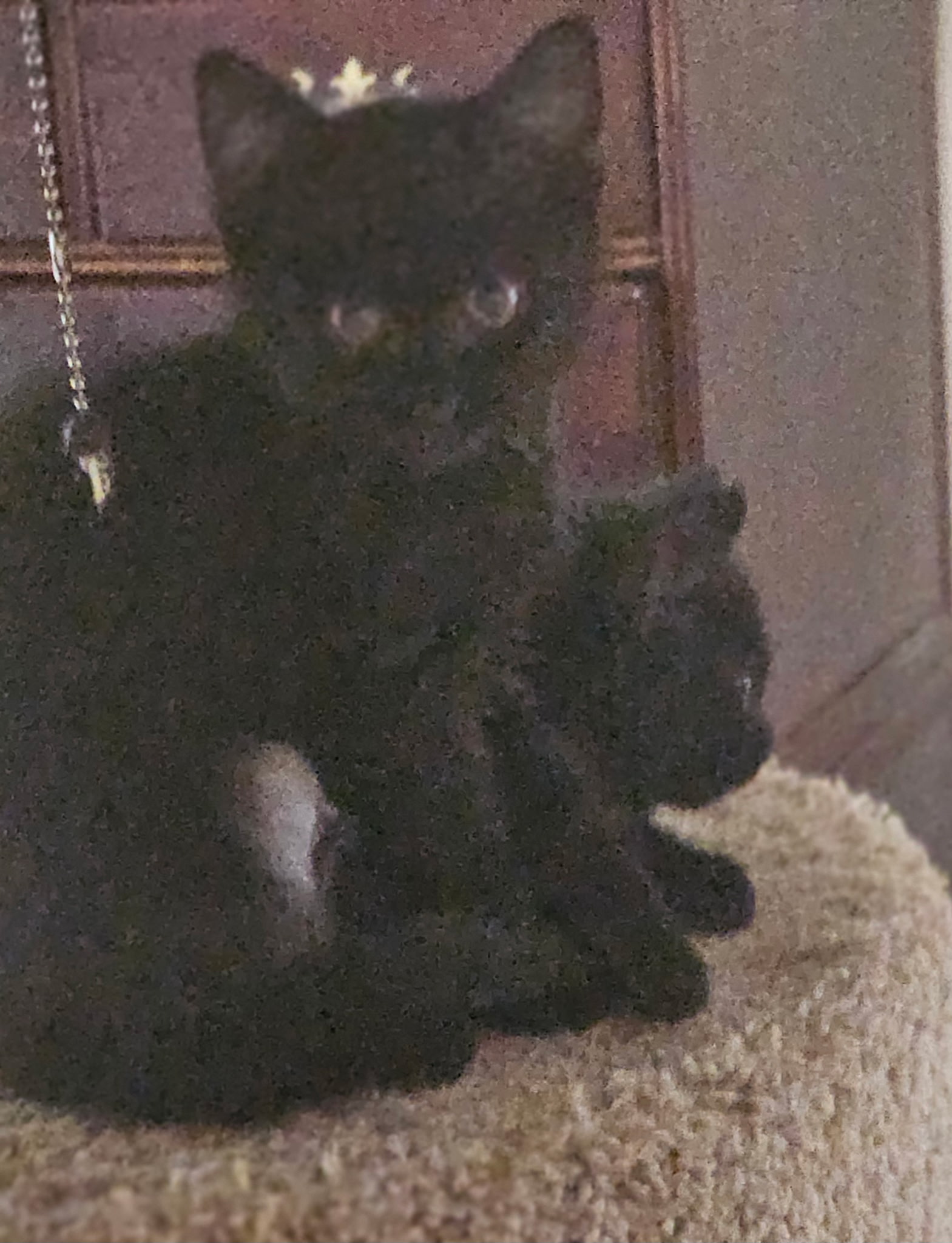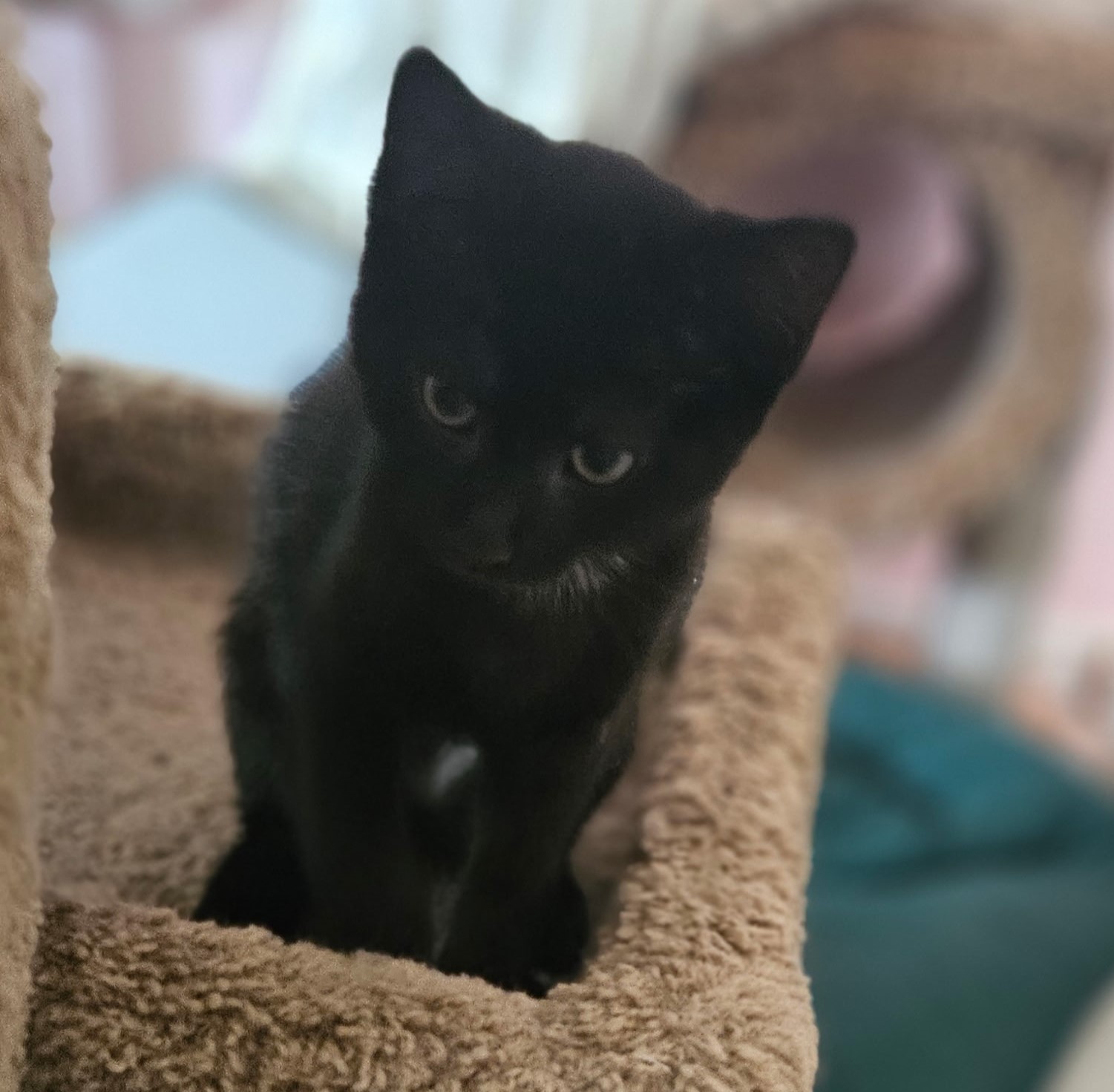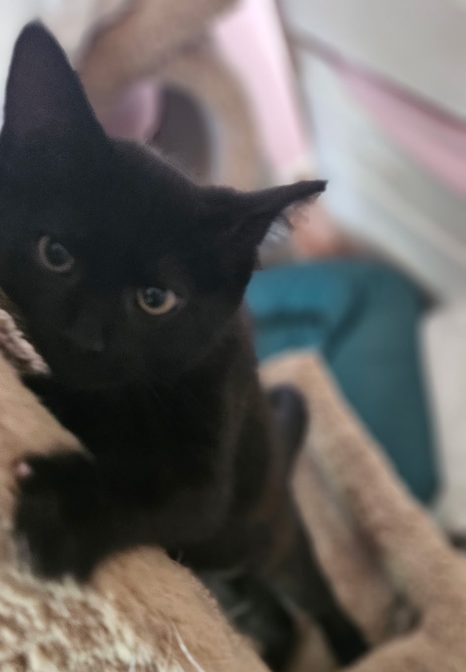 Abby is a small black kitten. She is shy at first, but friendly when she gets comfortable. She is not vocal like her siblings. She is a follower and hangs back to observe before she joins in. Although she does not demand attention, she purrs on contact. She loves to play with her siblings. Her favorite toy is a laser pointer.