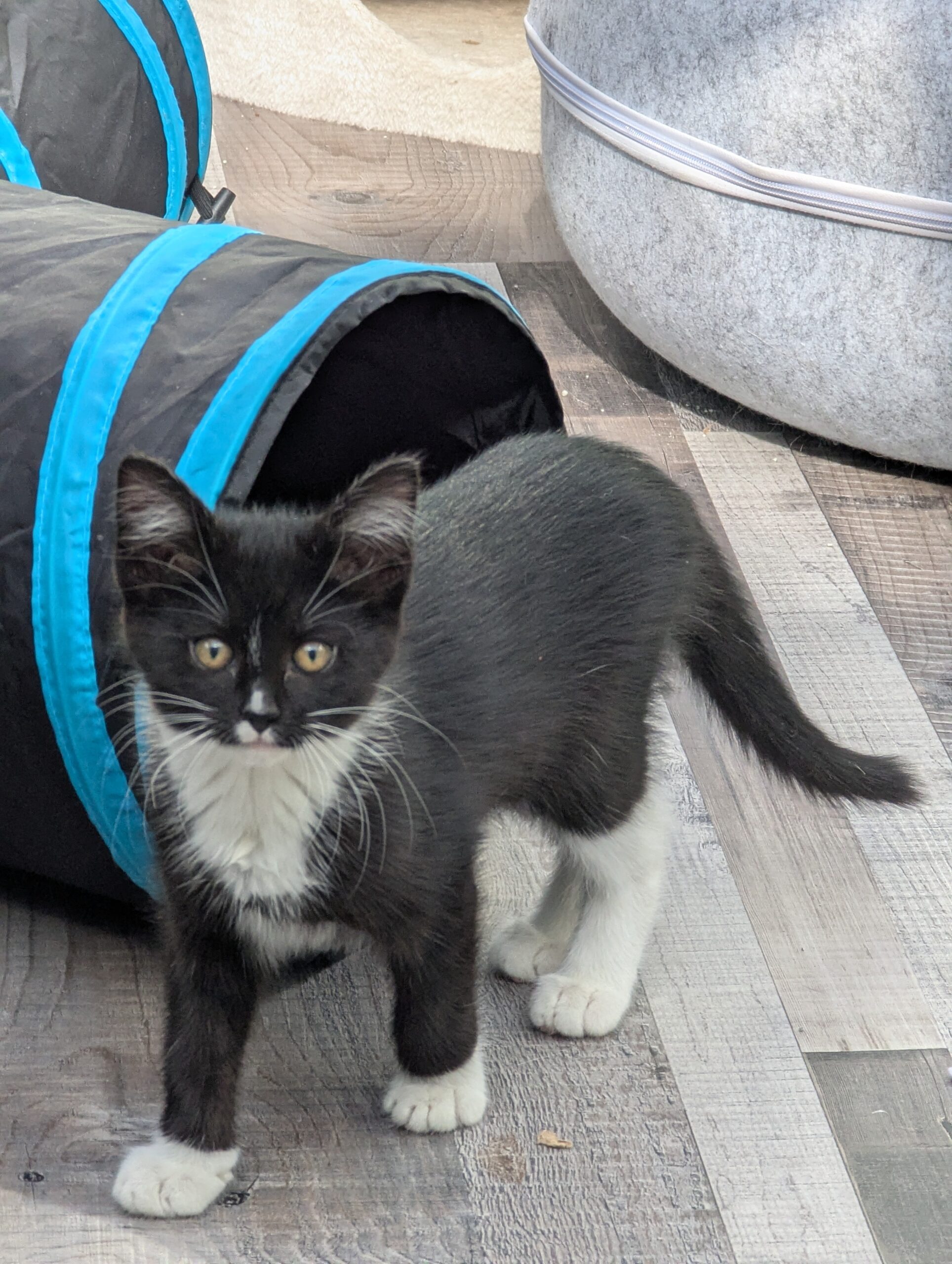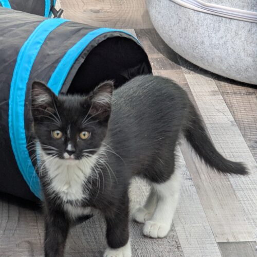 Danica (DOB 3/20/25) is a sweet and sociable kitten who balances curiosity and playfulness with a growing affection for people. With her bright eyes and gentle nature, she’s the one most likely to trot over and see what her humans are up to. She loves a good game of chase—whether it’s with a toy or another kitty (especially her foster friend Zena)—and she brings a calming presence to the group. Danica would thrive in a home where she can keep playing but also curl up nearby for some quiet time with her family. Since Danica was an outdoor kitty, she needs a patient owner to help continue socializing her into a loving companion.