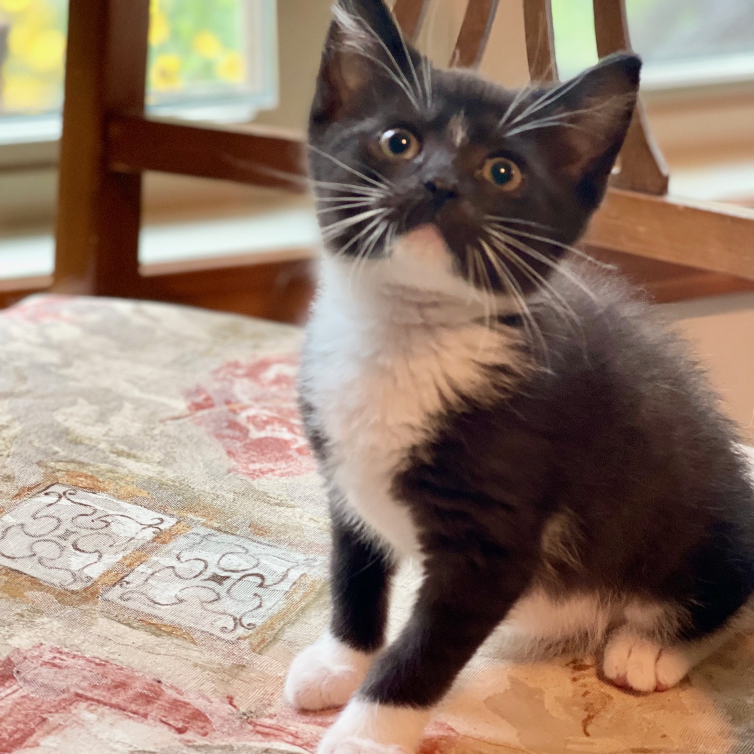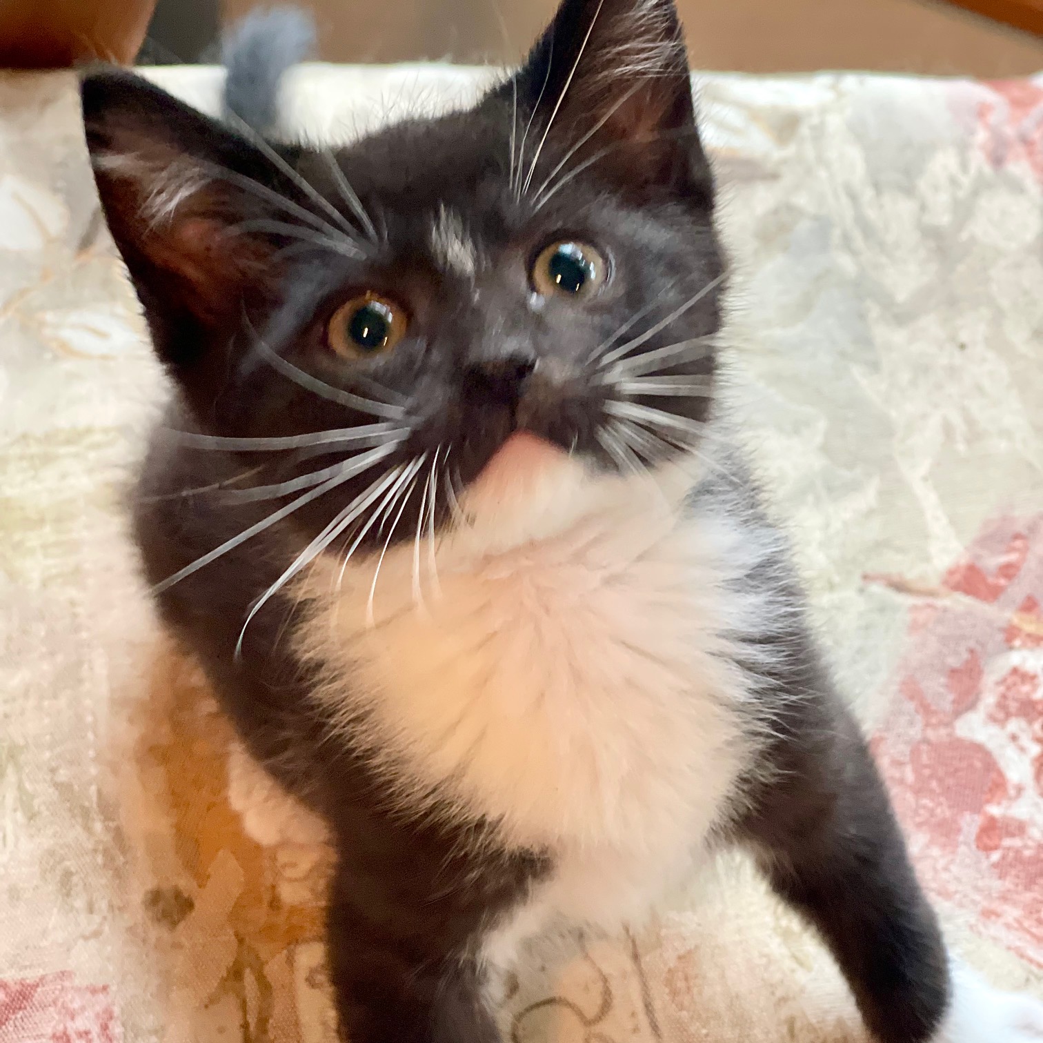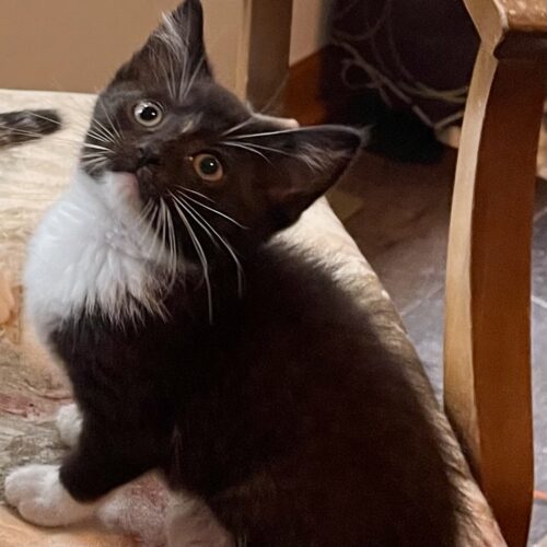 Donut and his siblings; Grape Nut and Corn Nut were rescued from a local shelter to help make room for a large intake of cats coming from a hoarding situation. This trio of kittens are sweet furballs, full of purrs and playfulness. They especially love kitty tunnels and wand toys. They are getting used to other cats and cat friendly dogs. Donut is a cute little black and white tuxedo with a big personality but is the smallest of his litter.