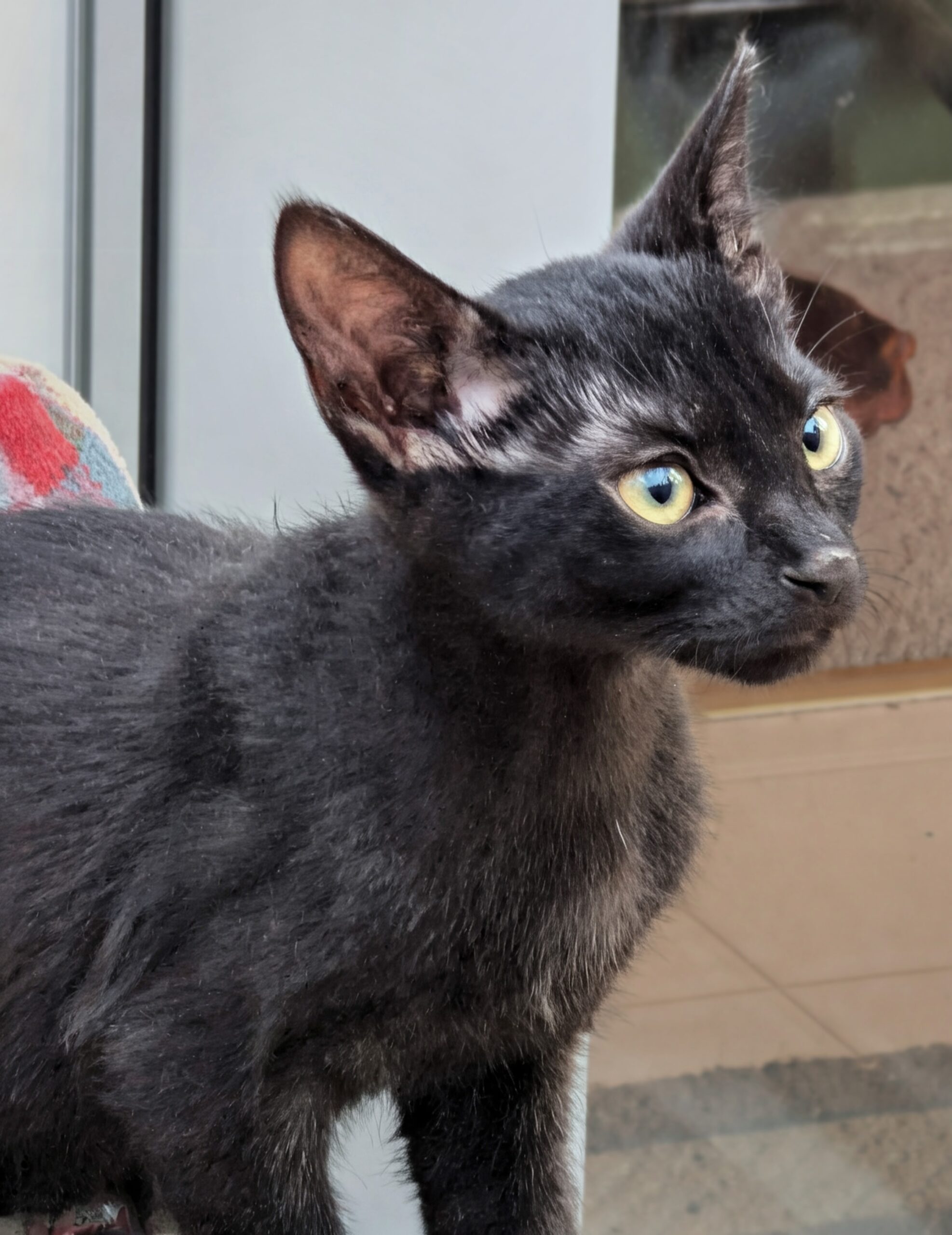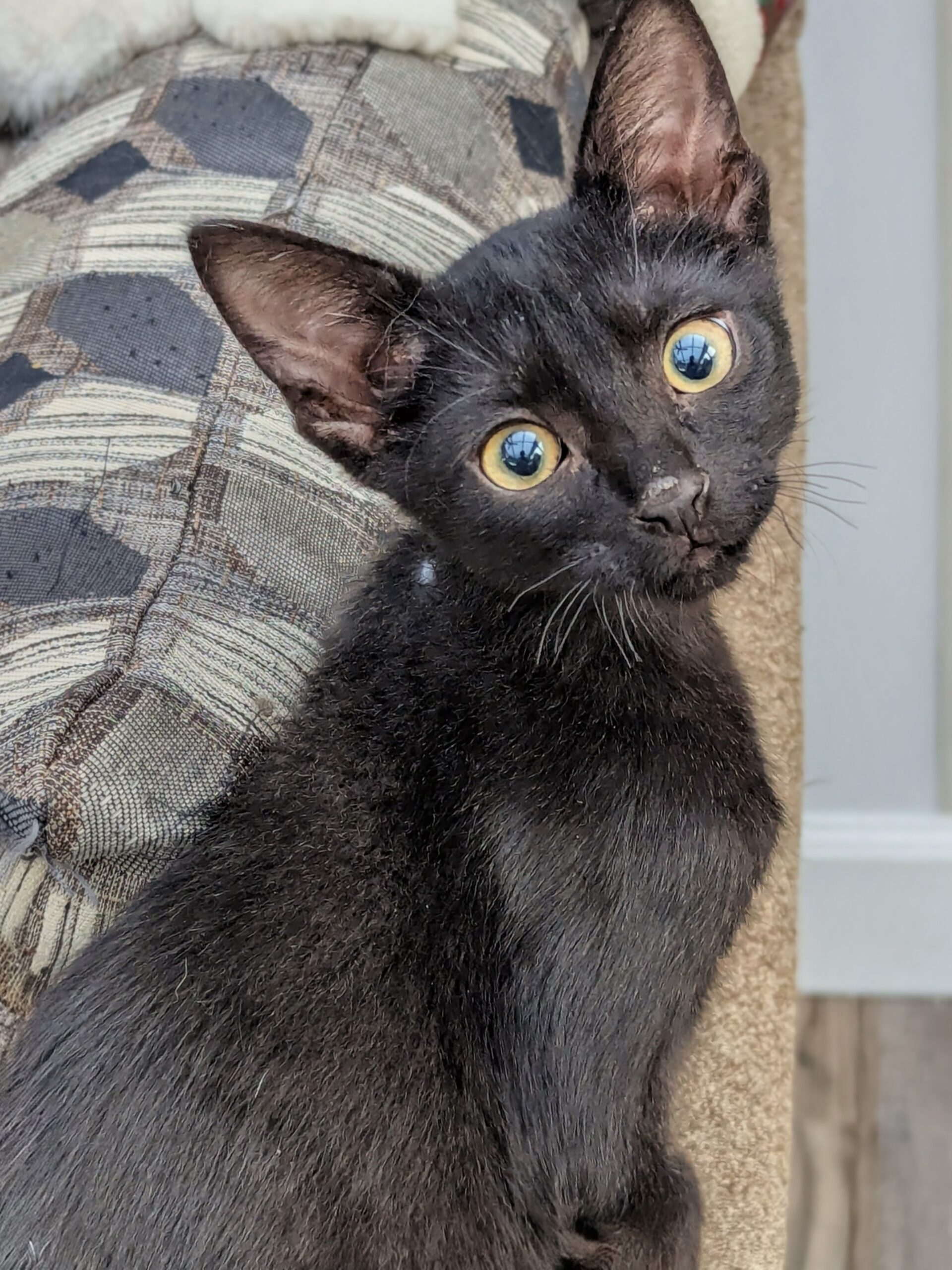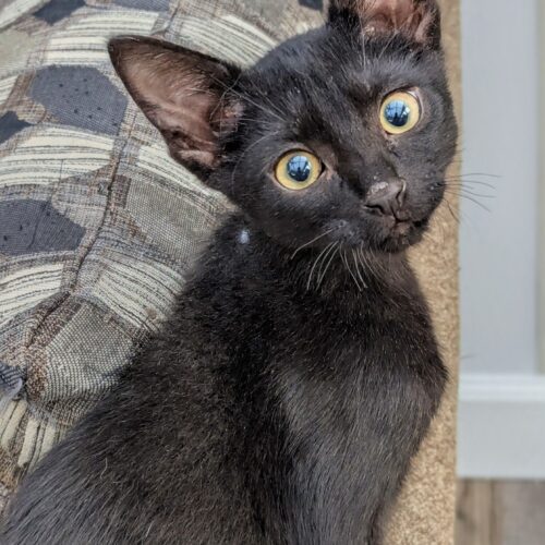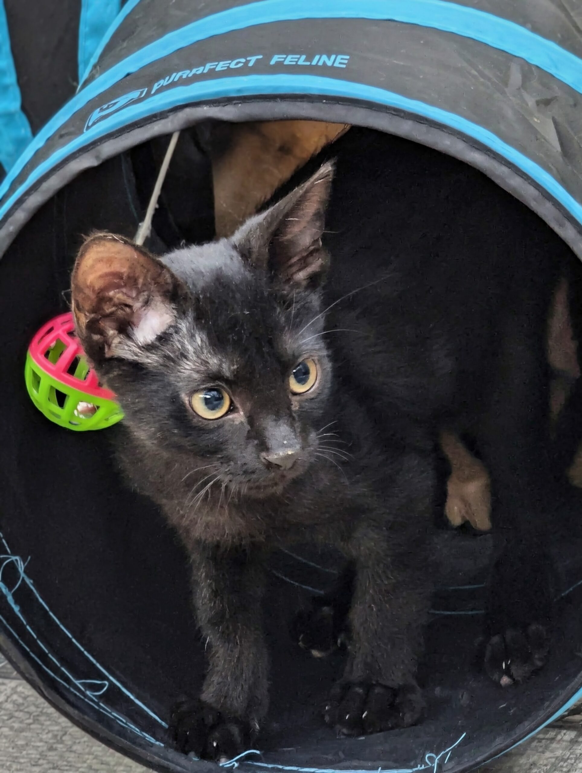 Eden is a sleek black kitten with a sweet and loving personality, born on May 11, 2025, in a dumpster that was about to be emptied. He and his brothers were rescued just in time at only four days old and brought to Kindred Kitties for bottle-feeding and care.