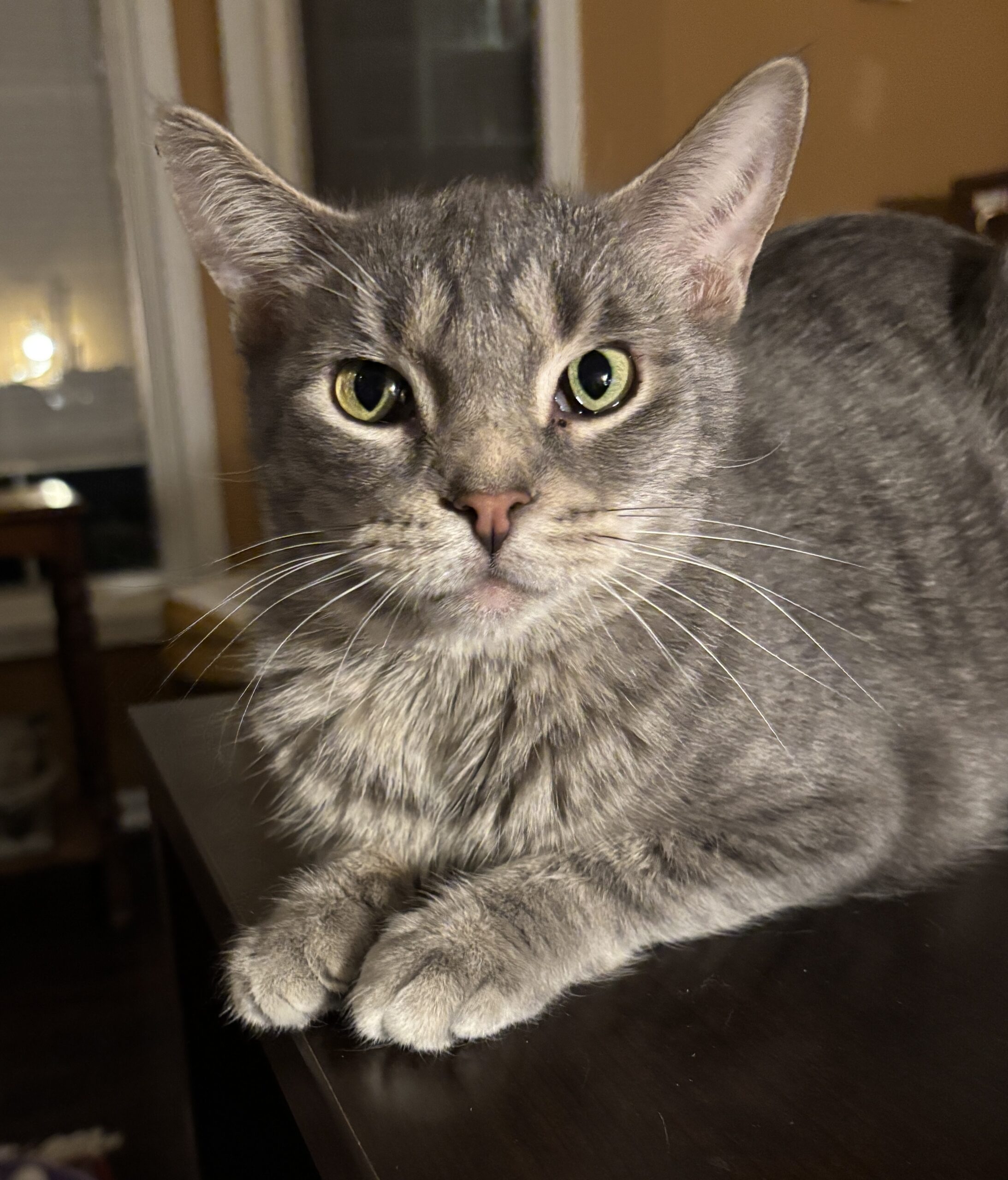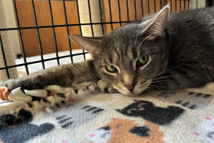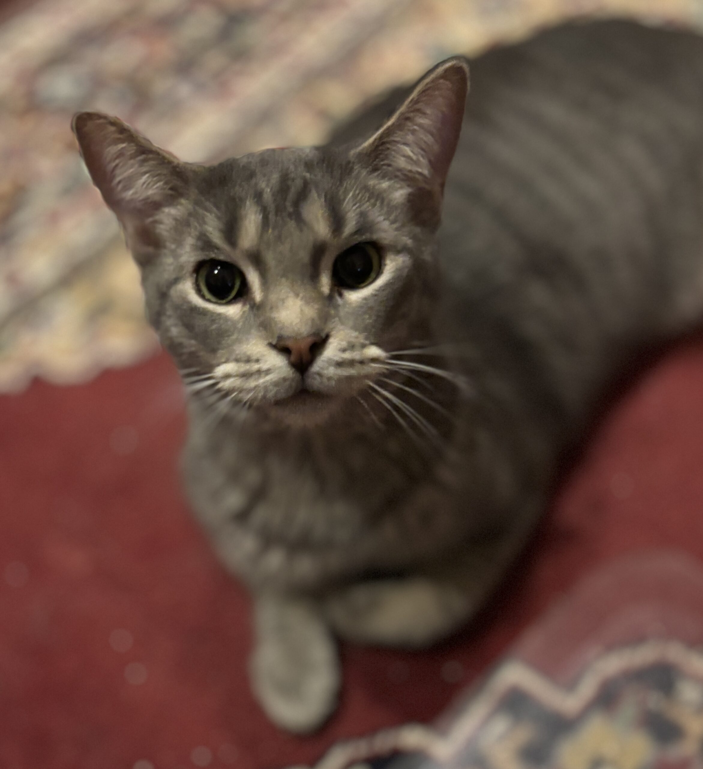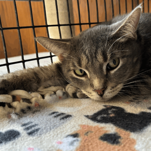 Ella is a gentle and adorable gray tabby with an estimated birthdate of March 1, 2022. Coming from a multi-cat household, she’s still learning to enjoy individual attention. Soft-natured and serene, Ella gets along well with other cats—but her heart truly belongs to her best friend, Miles.
