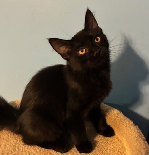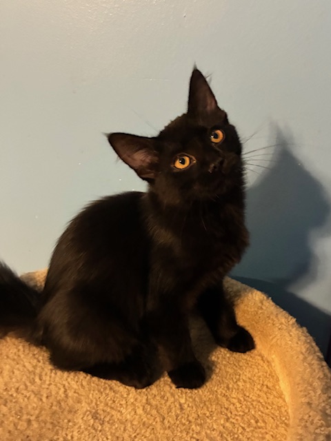 Elsie is a darling black female with an estimated birthdate of 04/28/2025. She always has something to say—and she says it with style! This talkative sweetheart chirps, trills, and meows her way through the day, keeping you in the loop on all the important kitten happenings. She’s social, outgoing, and loves attention, whether it’s playtime or cuddle time. Elsie is also super smart and curious, making her an entertaining and affectionate companion. Elsie needs to be adopted with one of her siblings (Eli, Ezra, Evelyn) OR to a home with another cat to keep her company.