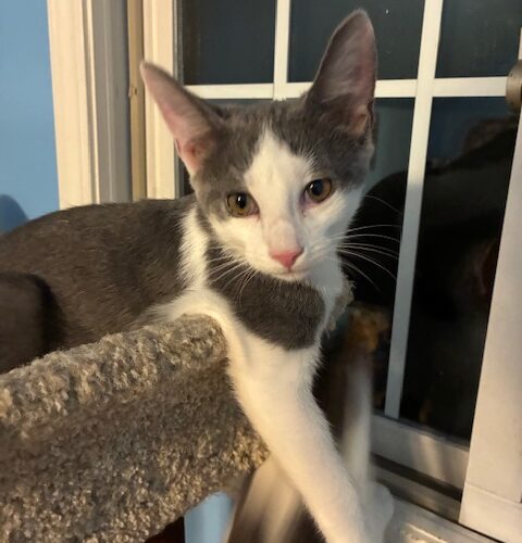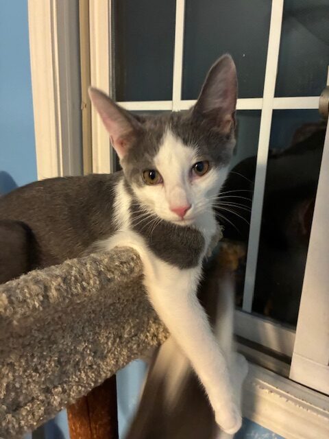 Ezra is an adorable gray and white male kitten with an estimated birthdate of 04/28/2025. He is delightfully torn between two loves: being pet and chasing anything that moves. One moment he’s zooming across the room in hot pursuit of a feather toy, the next he’s crawling into your lap for attention. Gentle and goofy, Ezra is the perfect balance of playful energy and affectionate charm. His expressive eyes and silly antics will keep you smiling all day long.