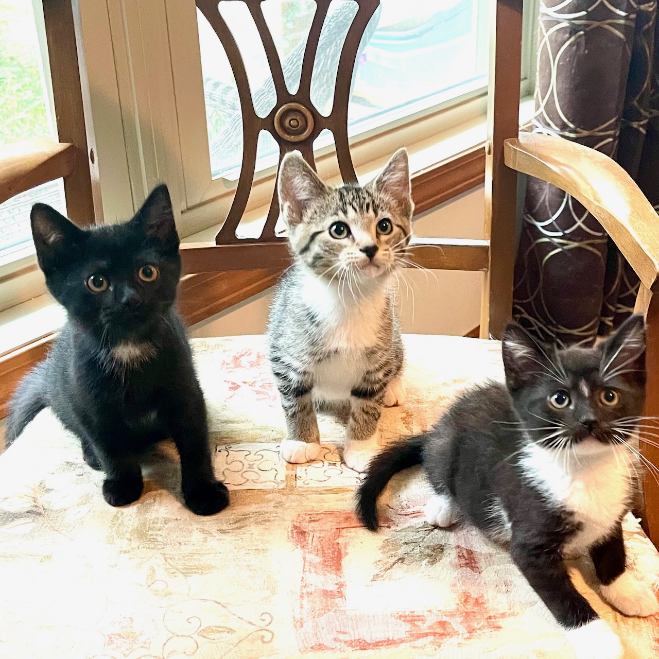 Grape Nut and his siblings; Donut and Corn Nut were rescued from a local shelter to help make room for a large intake of cats coming from a hoarding situation. This trio of kittens are sweet furballs, full of purrs and playfulness. They especially love kitty tunnels and wand toys. They are getting used to other cats and cat friendly dogs. Grape Nut is a little shy with new people at first but quickly warms up.