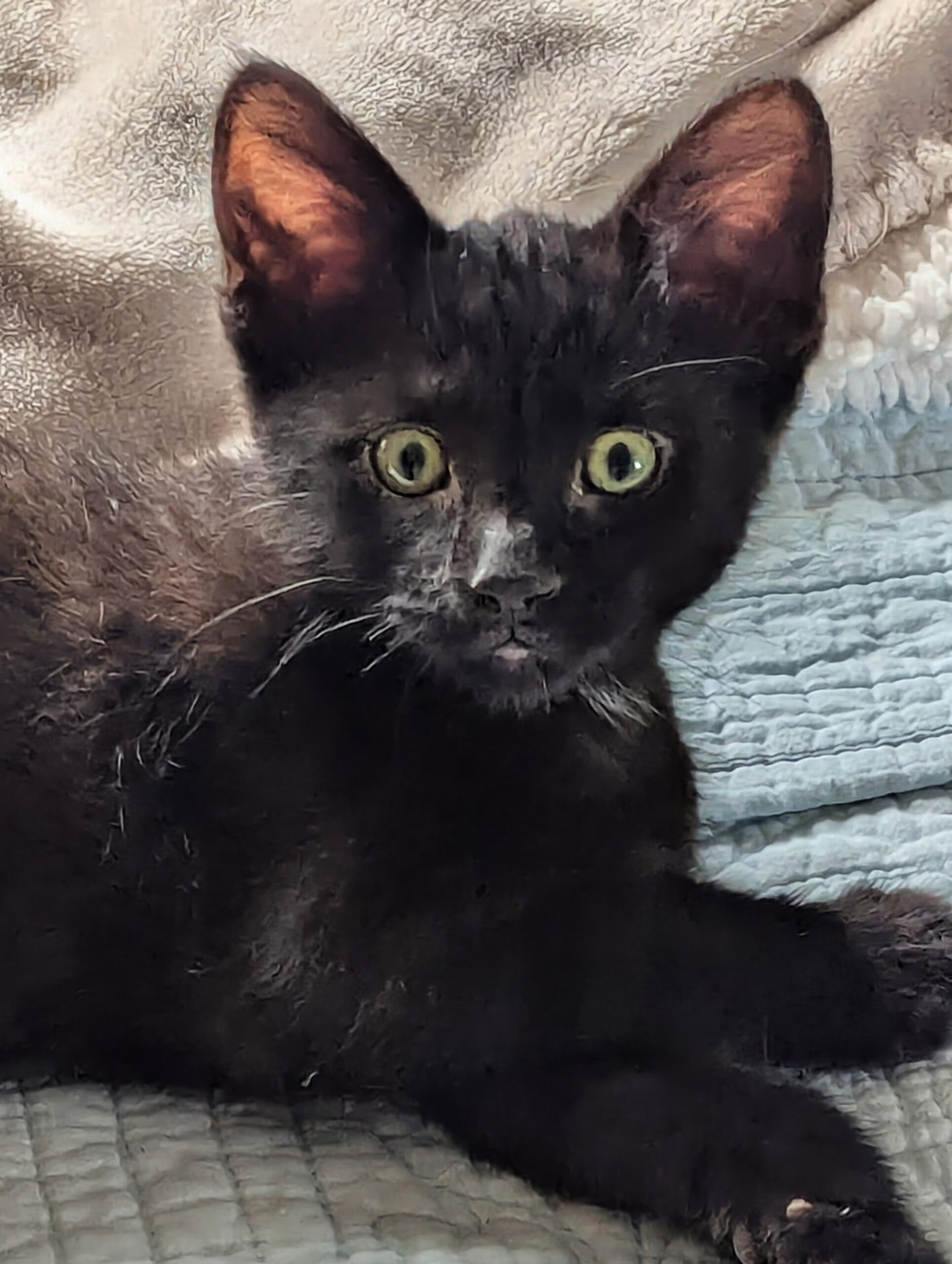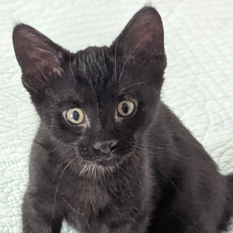 Grover is a short-haired black male kitten, born around July 19, 2025. He was rescued from a garage with his siblings and no mama cat, and raised by hand in a kind and caring foster home. Grover is a sweet and slightly shy boy who blossoms with a little patience. He loves gentle play, quiet snuggles, and being near his favorite humans once he feels safe.