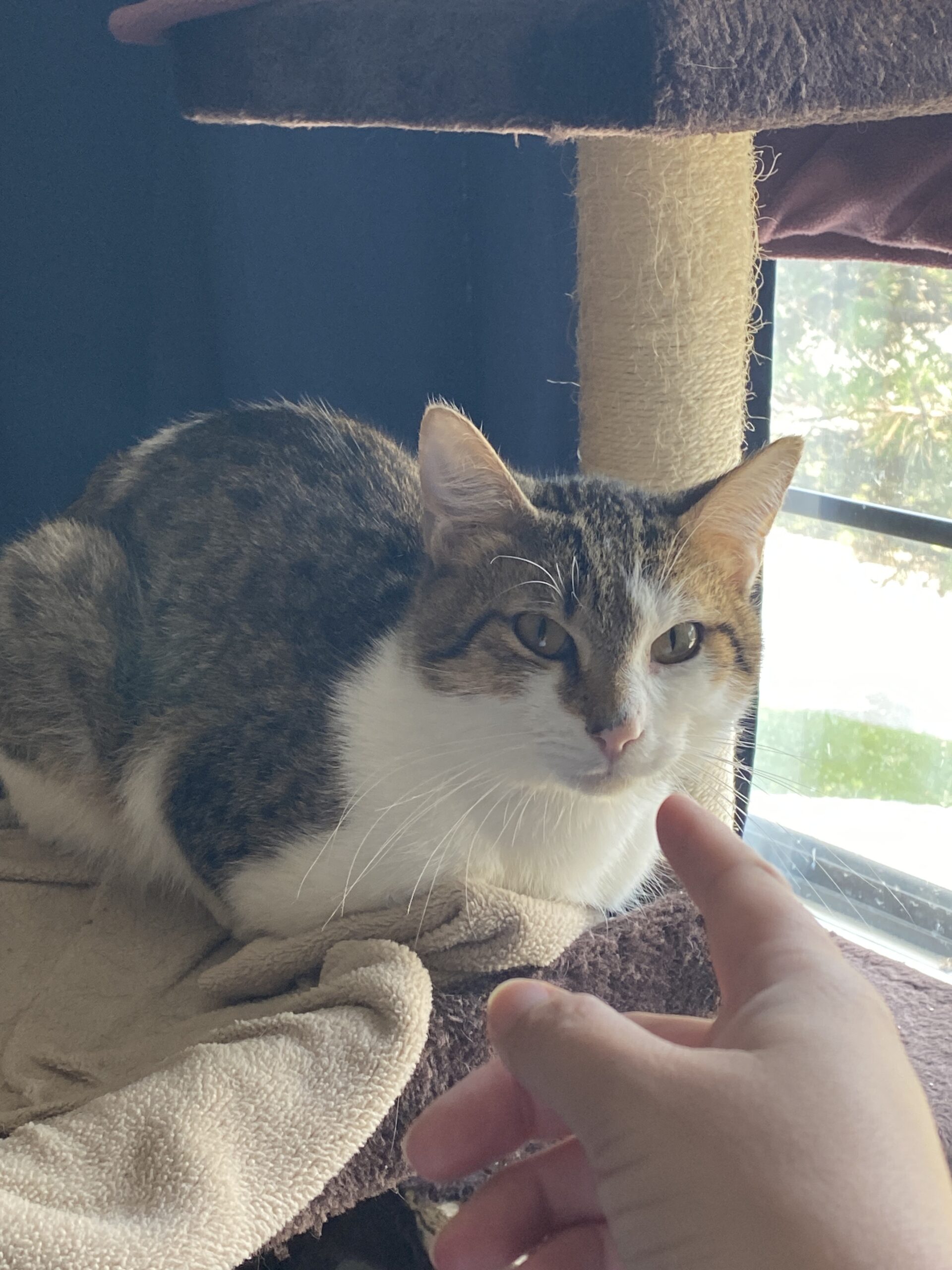 Hugo came from a home with lots of other cats, so he didn’t get much one-on-one attention early on. Because of that, he’s still a bit shy and skittish—sudden noises or quick movements can startle him—but he’s slowly learning that people can be kind and gentle.
