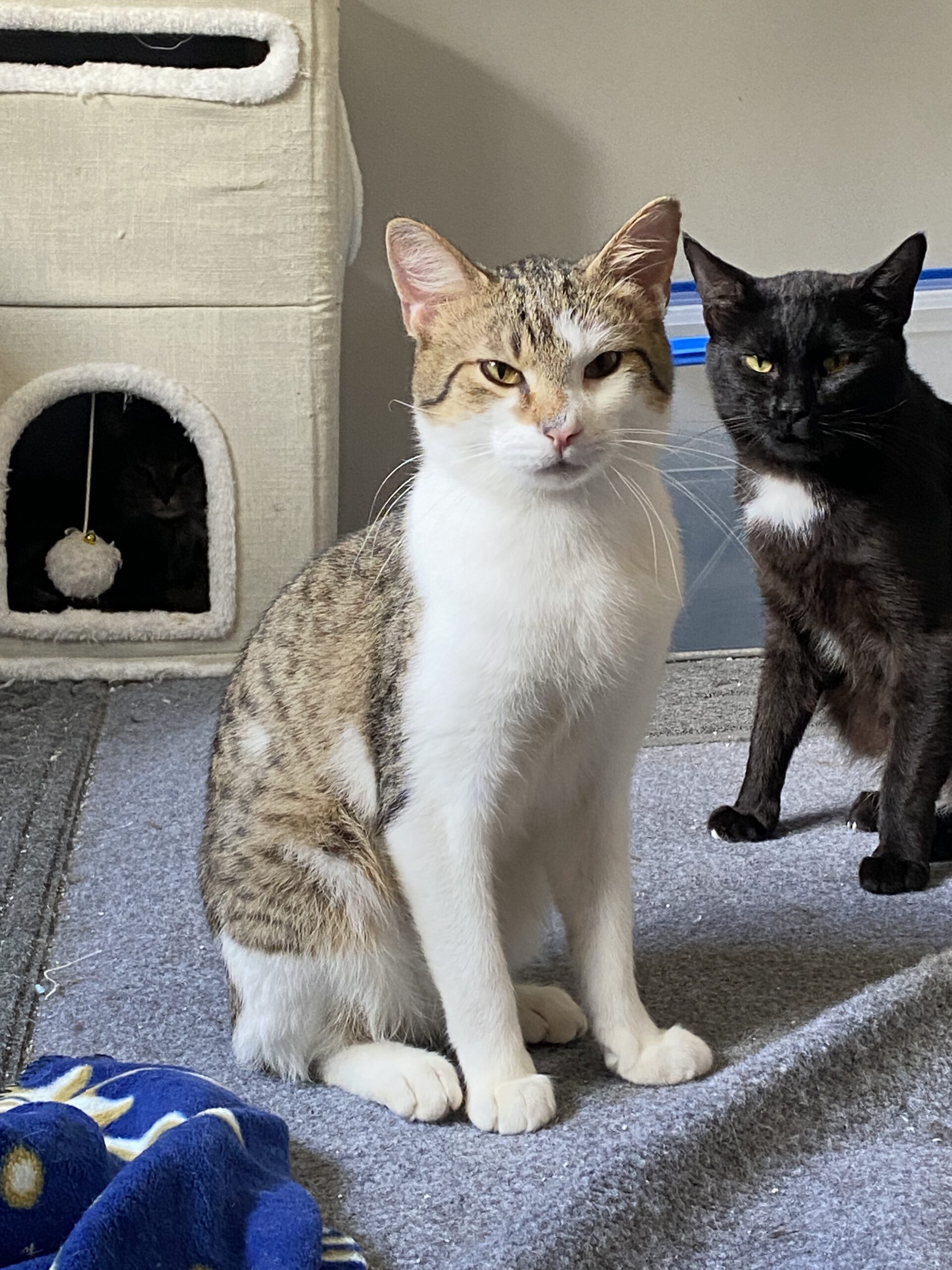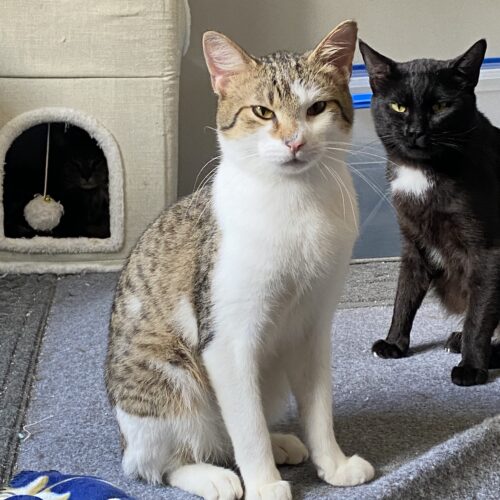 Hugo gets along beautifully with his foster brothers, Hudson and Homer, and he’d love to be adopted with Homer if possible. He’d also do well in a calm, quiet home with another friendly cat and patient humans who can give him time to feel safe.