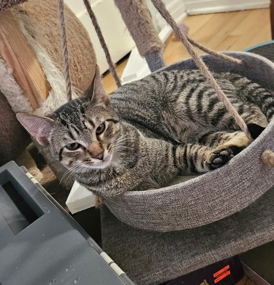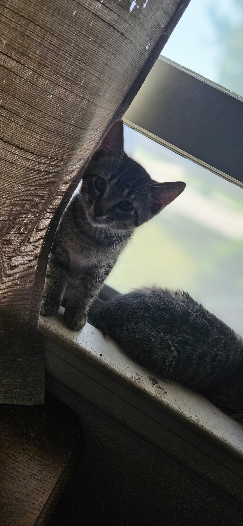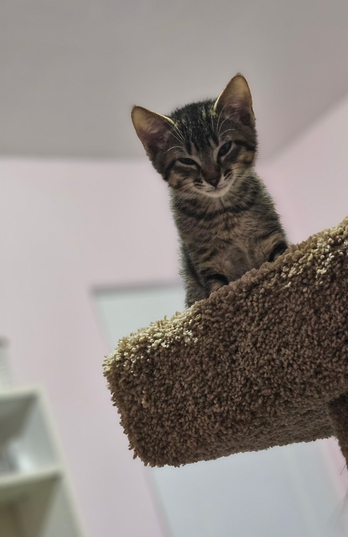Hunter is a little tabby boy. He is not as outgoing as his siblings. He is usually hanging around in the background following his siblings. He waits for them to check things out before he jumps in. He is a little shy at first. When he feels more comfortable, he joins in with his siblings vying for attention. He loves to play with his siblings, he has high energy and also purrs when given attention. He would be fine living with other cats or dogs.