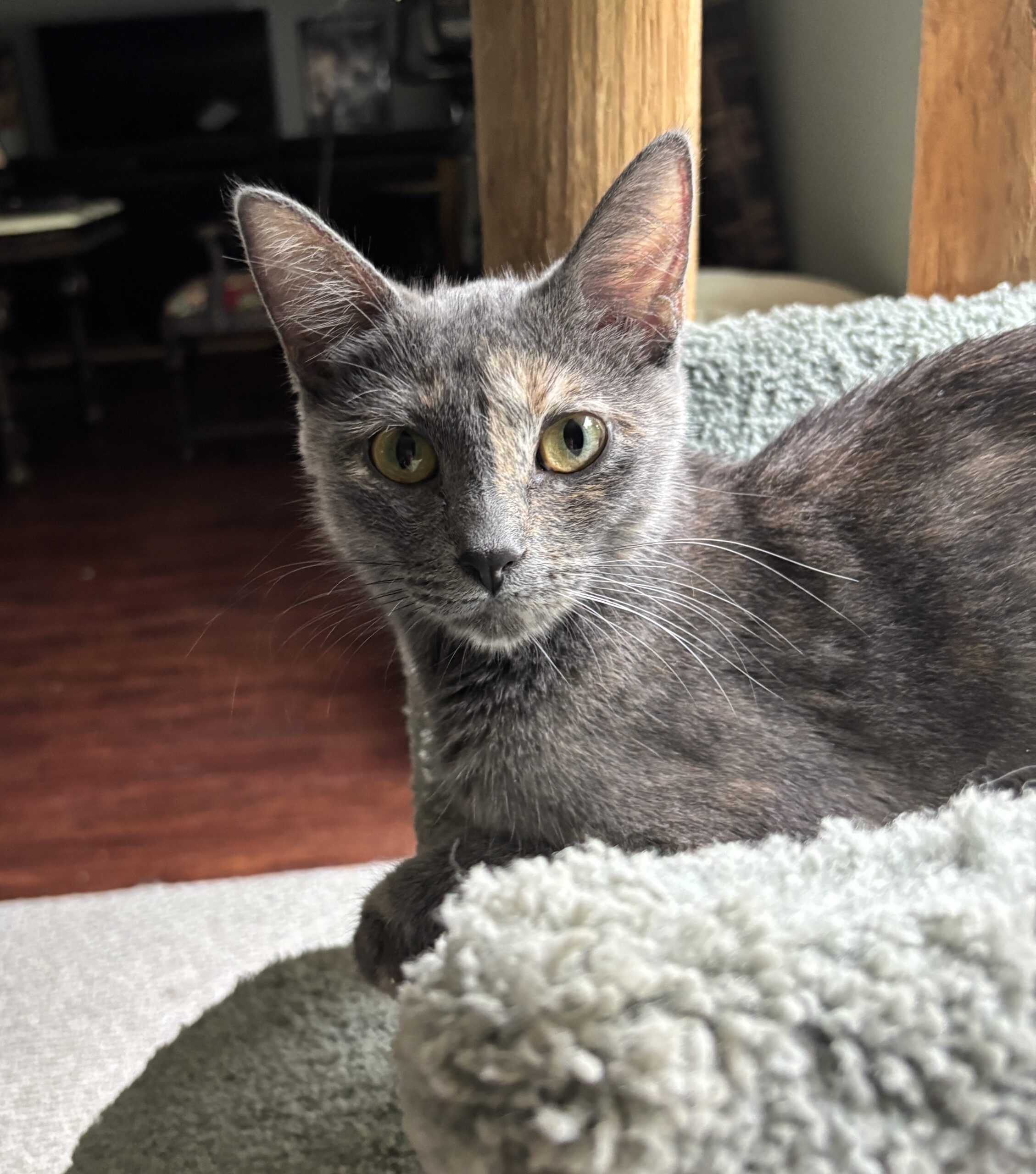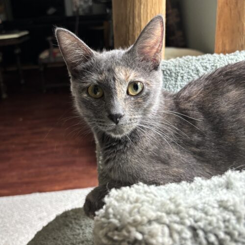 Mama Belle is a beautiful dilute tortoiseshell female estimated to be born on November 1, 2023. She was a devoted and gentle mama to her litter of five (Cheddar, Colby Jack, Nacho, Roquefort, and Brie) and now it’s her turn to be loved and pampered. Belle has a soft, loving personality and makes the sweetest little chirping sounds when she wants attention. She leans into affection and would thrive in a quiet home where she can soak up all the love she gave to her kittens. Belle is ready to trade motherhood for lap time and a forever family of her own.