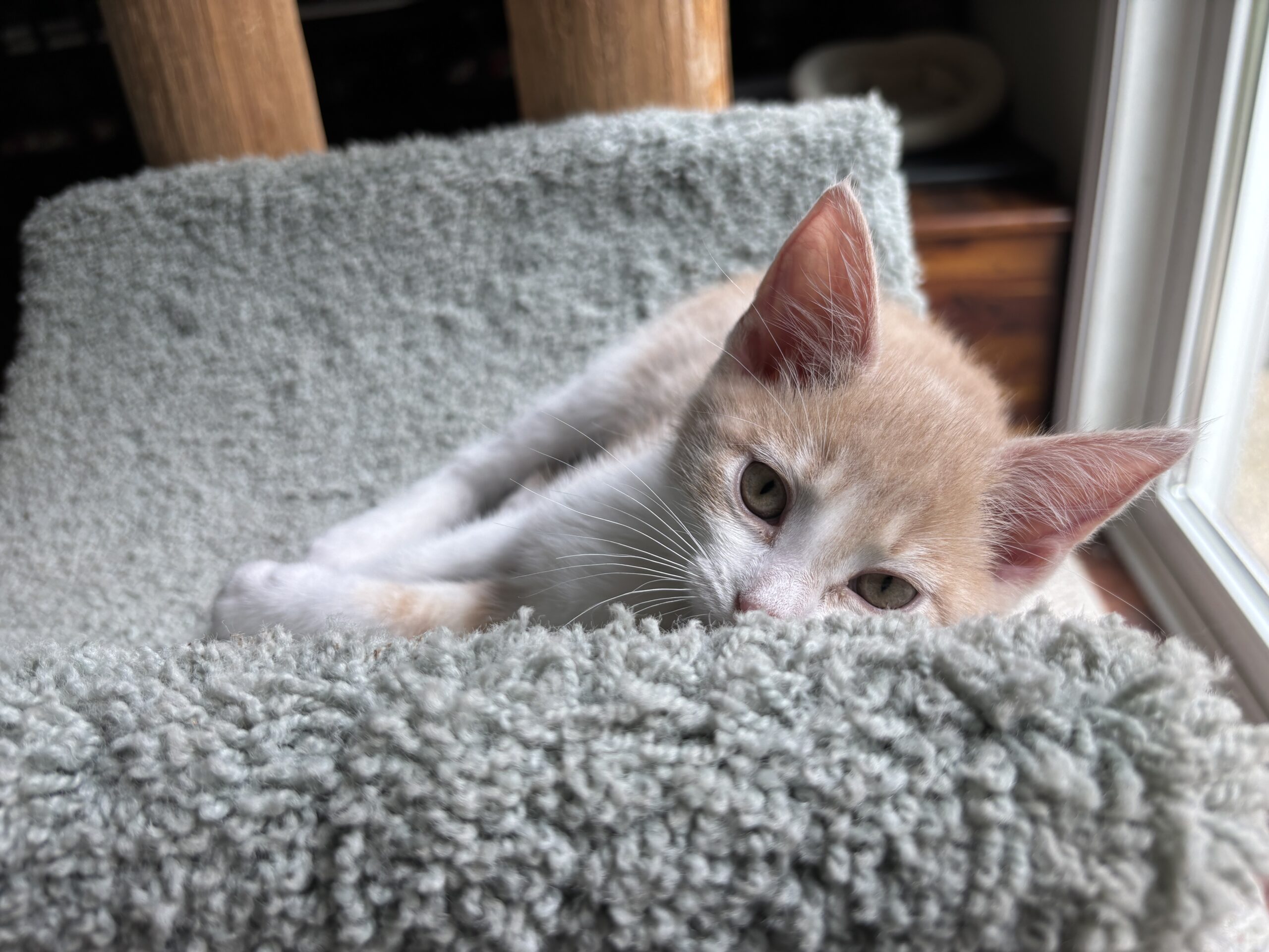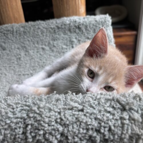 Nacho is a clever male kitten born on April 30, 2025, with a playful streak and a buff and white coat. He’s often the mastermind behind surprise pounces during playtime, carefully watching before making his move. Friendly, curious, and always alert, Nacho loves to be involved and is a great little helper around the house.