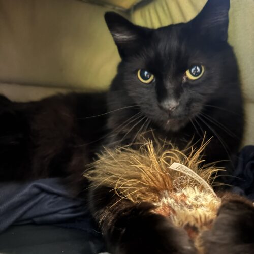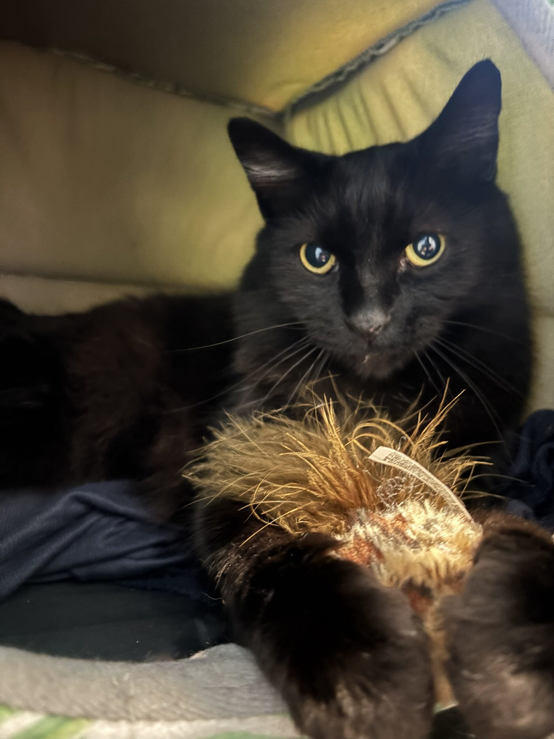 Sprite greets his favorite people with a soft little “meep meep,” and it’s impossible not to melt when he does. He loves watching the world go by from a cozy perch, playing with toys, and, of course, enjoying his treats.