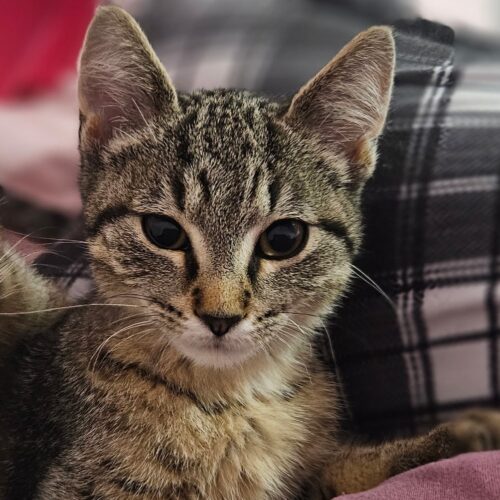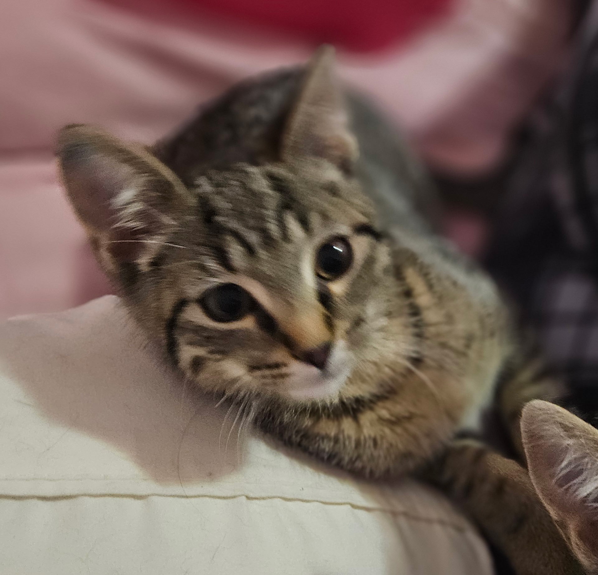 Zion is a friendly, outgoing tabby kitten. It is hard to tell the difference between Zion and Norah. They are both very vocal in their demand for attention. They both purr immediately upon contact. They love to lie on you and fight for who can be closer to you. Zion is curious and fearlessly explores everything. He is very playful with his siblings or with anything else he can find. He would be fine living with other cats or a dog.